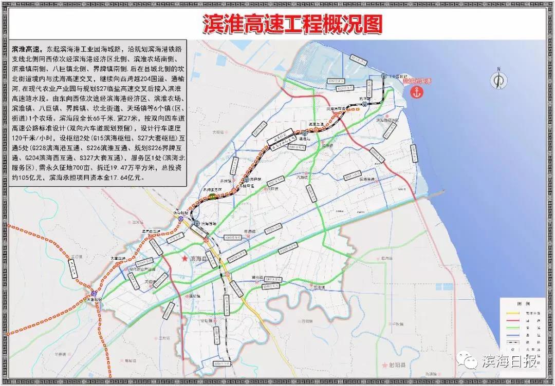 滨海至淮安高速公路盐城段是省政府批复的《江苏省高速公路网规划(2017-2035年)》“十五射六纵十横”中“横四线”(S18)的重要组成部分。项目东起滨海港工业园区海城路,由东向西依次途经滨海港经济区、滨淮农场、滨淮镇、八巨镇、界牌镇、坎北街道、天场镇等6个镇(区、街道)1个农场,路线全长65.100公里。项目全线采用双向四车道高速公路标准建设,设计速度120公里/小时。核定初步设计概算为102.7亿元。项目建成后,对提升沿海港口集疏运能力,促进钢铁等重大产业项目向沿海加快转移,支撑淮河生态经济带战略深入实施,推进沿线城镇、产业、港口融合发展具有重要的意义和作用。
