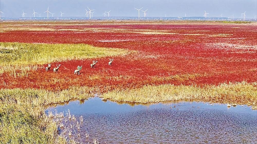 秋日的条子泥有一种颜色,绝对会让每个人都向往之。火红的盐蒿草连绵铺展,给美丽海湾披上了成片锦绣。迁徙候鸟和野生麋鹿,是红毯上跃动的精灵,充满了生机和野趣,和谐之美,尽在湿地。