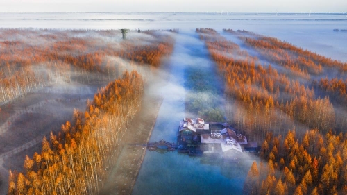 每年深秋时节,是黄海森林一年中最美的时候,深秋的水杉树叶,红似火,黄如金,风景如诗如画,令人沉醉。