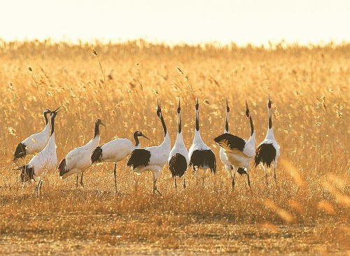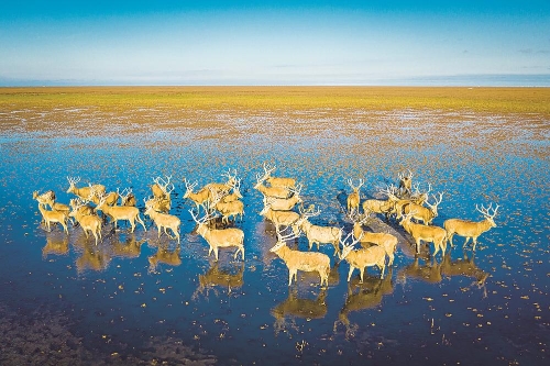 在中华麋鹿园内,不仅可以看到百鹿奔腾的壮观场面,还能观赏到丹顶鹤、东方白鹳、天鹅、大雁、大白鹭等国家一、二级保护动物的英姿。成群结队的珍禽飞鸟,奶油色的芦苇荡,一片连着一片的红果盐蒿和错落有致的沼泽湿地尽现眼前,麋鹿穿梭在五彩斑斓的乌桕林中,组成了一幅令人陶醉的生态风景画。在这里漫步,你会感受到大自然的神奇力量,让你的心灵得到极大的放松和治愈。