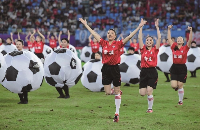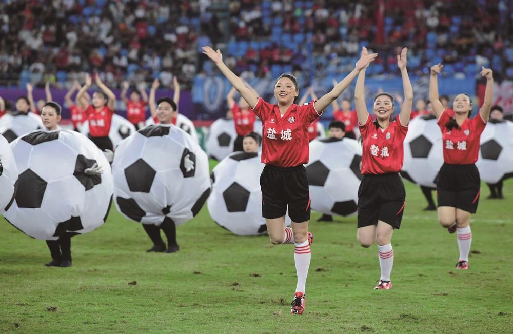 10月8日,“苏超”比赛,盐城主场迎战无锡,场内表演由盐都区承办,来自盐都区8个乡镇、青海省玉树藏族自治州称多县及市淮剧团组成的11支表演方阵、超300名演员齐聚现场。威风锣鼓、青狮舞、龙舞等盐都非遗节目尽显本土特色;称多县的康巴伊舞《吉祥祝福》则传递出浓郁民族风情。