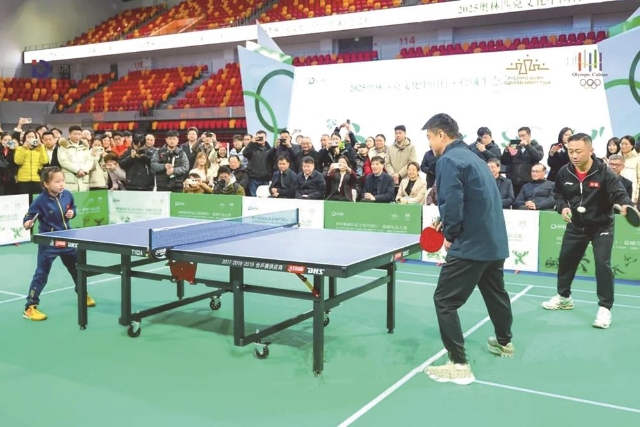 3月3日,2025奥林匹克文化中国行·盐城生态之旅在盐城奥体中心盛大启动。由许海峰、王皓、张楠、鲍春来、骆晓娟、张会、郭伟阳、王丽萍、吴敏霞、阎森等10位冠军组成的“金牌天团”,亲临现场与盐城市民一起参观奥林匹克文化展,与乒乓球、羽毛球爱好者们进行友谊赛,一起感受奥运精神,共赏盐城生态之美。