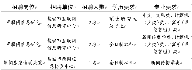 盐城市互联网信息研究中心、盐城市新闻应急协调中心为隶属盐城市委宣传部管理的全额拨款事业单位。因工作需要,拟面向江苏省内“211工程”类高等院校2013年应届毕业生公开招聘事业单位工作人员。