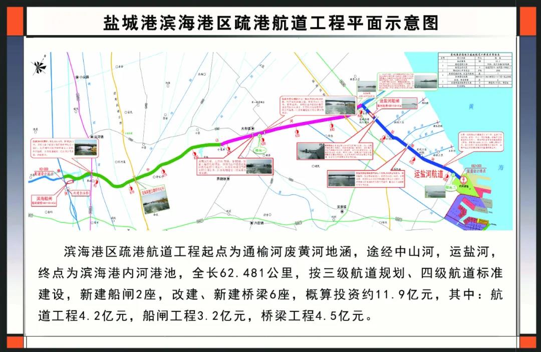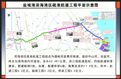 滨海港区疏港航道工程起自连申线(通榆河)废黄河地涵,经中山河、运盐河、新滩北河,止于滨海港内河港池,全长62.5千米,概算总投资11.44亿元,按三级航道标准规划、四级航道标准建设,最大设计船舶通航等级为500吨级,航道底宽不小于40米,最小水深2.5米,航宽不小于55米,最小弯曲半径320米;新建滨海船闸、运盐河船闸2座,规模均为180×18×4.0米(闸室长×口门宽×门槛水深);改(新)建桥梁6座,通航净空55×7米,并一孔跨越通航水域;建设停泊锚地2处,并布设航道标识标牌、环保绿化等配套工程;防洪设计水位为20年一遇设计标准,设计最高通航水位为10年一遇设计标准,设计最低通航水位为95%保证率的水位。该工程是滨海港区集疏运体系和区域航道网的重要组成部分,是综合运输体系中不可获缺的有机构成。航道的通行对完善港口功能,拓宽港口辐射范围,加快滨海港区发展,同时完善区域综合运输体系并促进沿线经济社会发展,具有重要的意义。