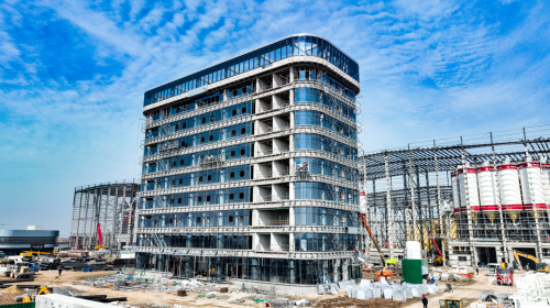 “目前我们综合办公楼正在进行内部装修;生活区已基本建成,正在进行室外配套施工;3栋厂房已进入外墙板和屋面瓦安装阶段,本月底完成;生产设备也全部安装到位,正在进行储料罐和运行皮带拼装。”该项目负责人刘辉煌介绍道,目前已经完成总项目进度的80%左右,为了确保项目建设进度,每天都有600多人、50多台设备在作业,全力以赴加紧施工,确保项目如期建成投产。