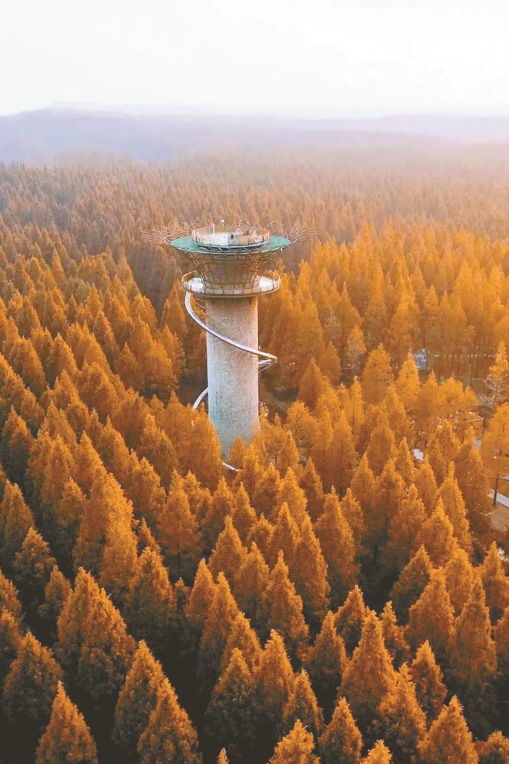 黄海森林的水杉树叶,红似火、黄如金,风景如诗如画,令人沉醉。站在森林之眼之上,俯瞰整片杉树林,远远望去好似一片橙红色的海洋。站在森林之眼的观景台上,仿佛能吸入整个森林的清新与活力。镜头下是生命蓬勃的力量,是自然无尽的故事。