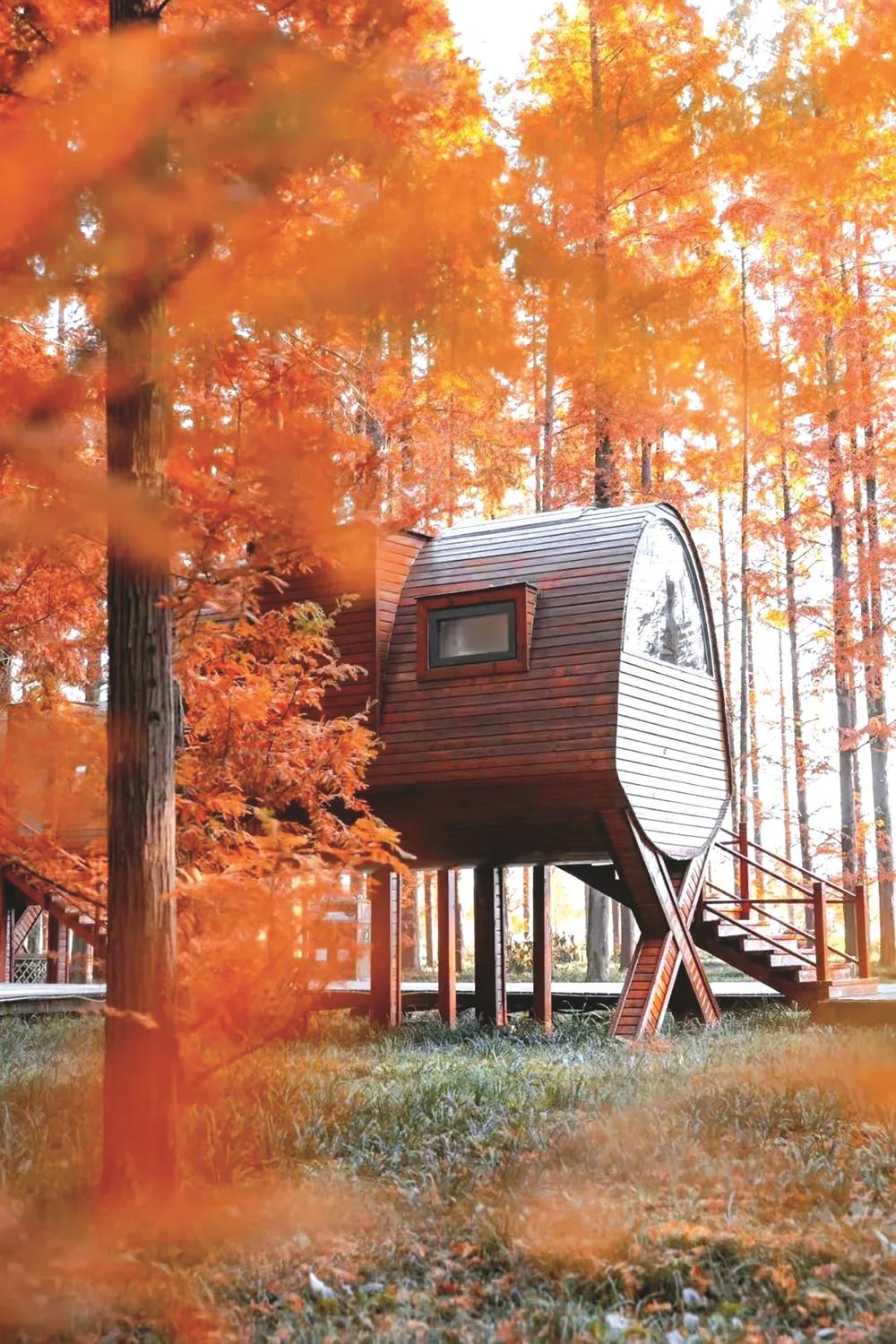 以红杉为背景,穿梭于木屋与树木之间,黄海森林的红杉风光,无时无刻不在绽放其独特魅力。