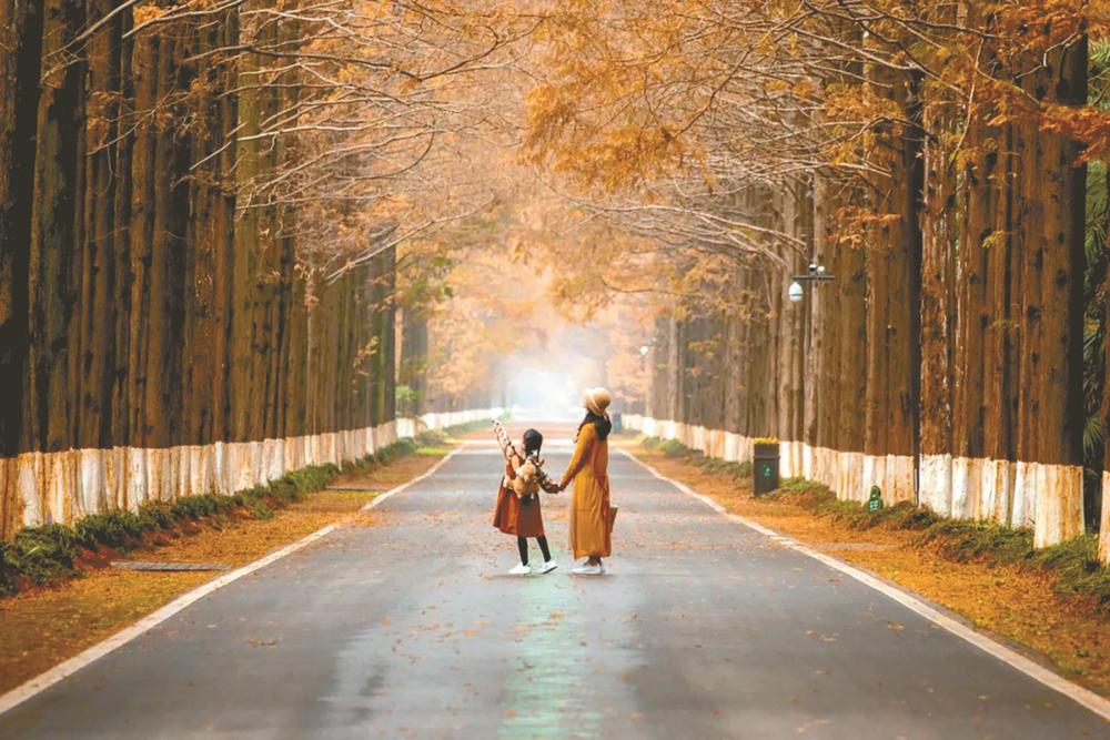 在黄海森林公园的水杉长廊下拍照打卡,每一次快门都是对自然之美的致敬。