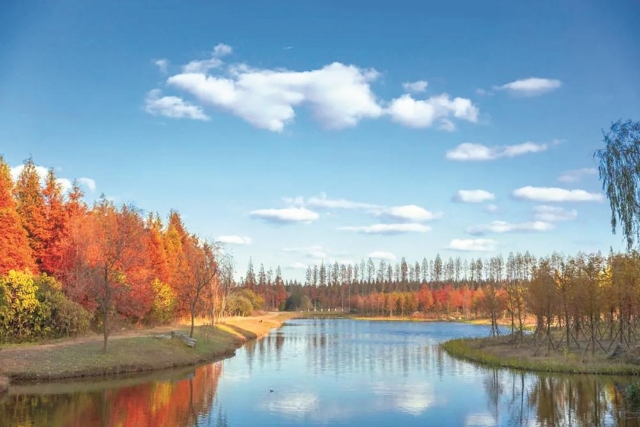 阳光和煦,红杉映衬,贯穿东西的湿地长廊风景带显得格外有意境。远处水波粼粼,近处芦苇轻摇。在湿地长廊点位打卡拍照,仿佛置身于一幅流动的画卷中,每一处光影都是自然的馈赠。
