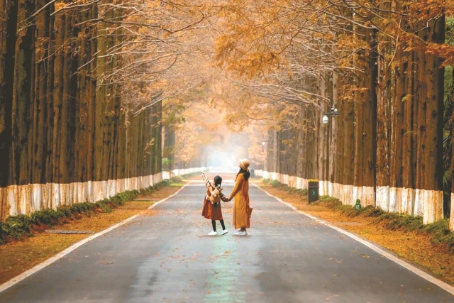 在黄海森林的怀抱中,笔直的水杉树如忠诚的卫士整齐地列队于大道两侧,向远方无限延展勾勒出一幅动人心魄的初冬画卷。