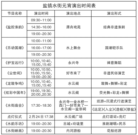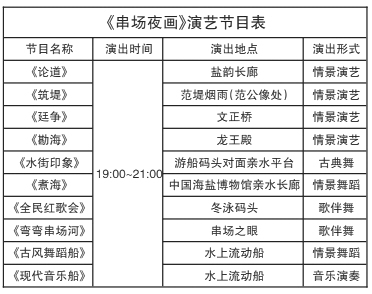 漂舟戏苑(《盐腔淮韵》《水街映画》起点)——水街东门入——水云阁(《炫彩中国年》《水街庙会》巡游点位)——好市来了(《乐动国潮》《尘世间》《水街庙会》巡游点位)——永兴寺(《护宝远行》《水街庙会》起点)——古城饭店、玲珑里饭店二楼平台(《水韵乐坊》)——盐宗祠(《祭盐大典》《水街庙会》终点)——游船码头(《串场夜画》北线两岸演出)。