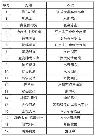 开放大道宴澜亭南(最“盐”城、“盐城”霓虹灯墙)——水街东门(鱼跃龙门、欢乐新禧街有你)——初味门店北(如鲸向海霓虹墙)——麦当劳南(青花国潮兔)——永兴寺(怡水桥祈福锦鲤、荷塘月色、星空祈愿霓虹墙)——好市来了南(天水桥蝴蝶漫天生命树、春水桥月下婵娟、文创街区萌动熊猫)——酒文化博物馆(迎宾神龙长廊)——水云阁东(神龙赐福)——水云阁西(灯火盐城)——水街西门(鸟语花香、赛龙舟、富贵宫灯)——游船码头(祈愿孔明灯、古今瓢城、古八景盐城文化墙、水街·串场河网红地标)——Mone酒吧(龙舞人间、舞动未来·燕展长空)——盐田夜市(朋克时代、盐田夜市热气球)——开放大道宴澜亭南(最“盐”城)。