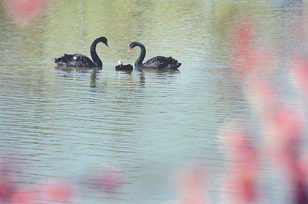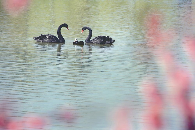春分时节,天气还是有些微凉,人们还没有脱下厚重的棉衣,即使这样也挡不住梅花欣喜地向人们报春。梅花湾内,800年宋梅、500年梅王梅后自然不能错过。傲然绽放的梅花、结伴游过的黑天鹅,点缀着秀美的湖景风光。