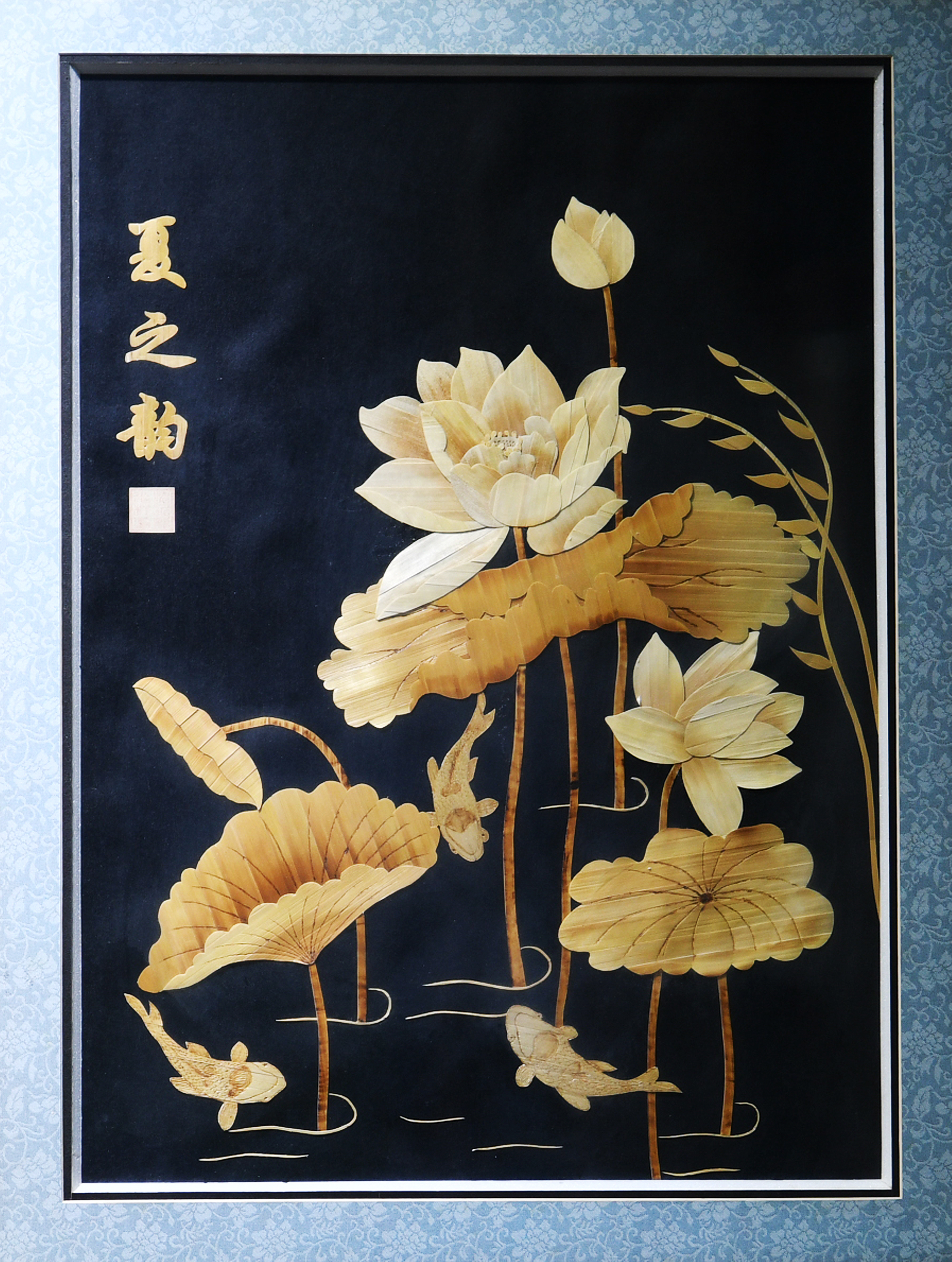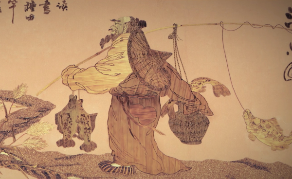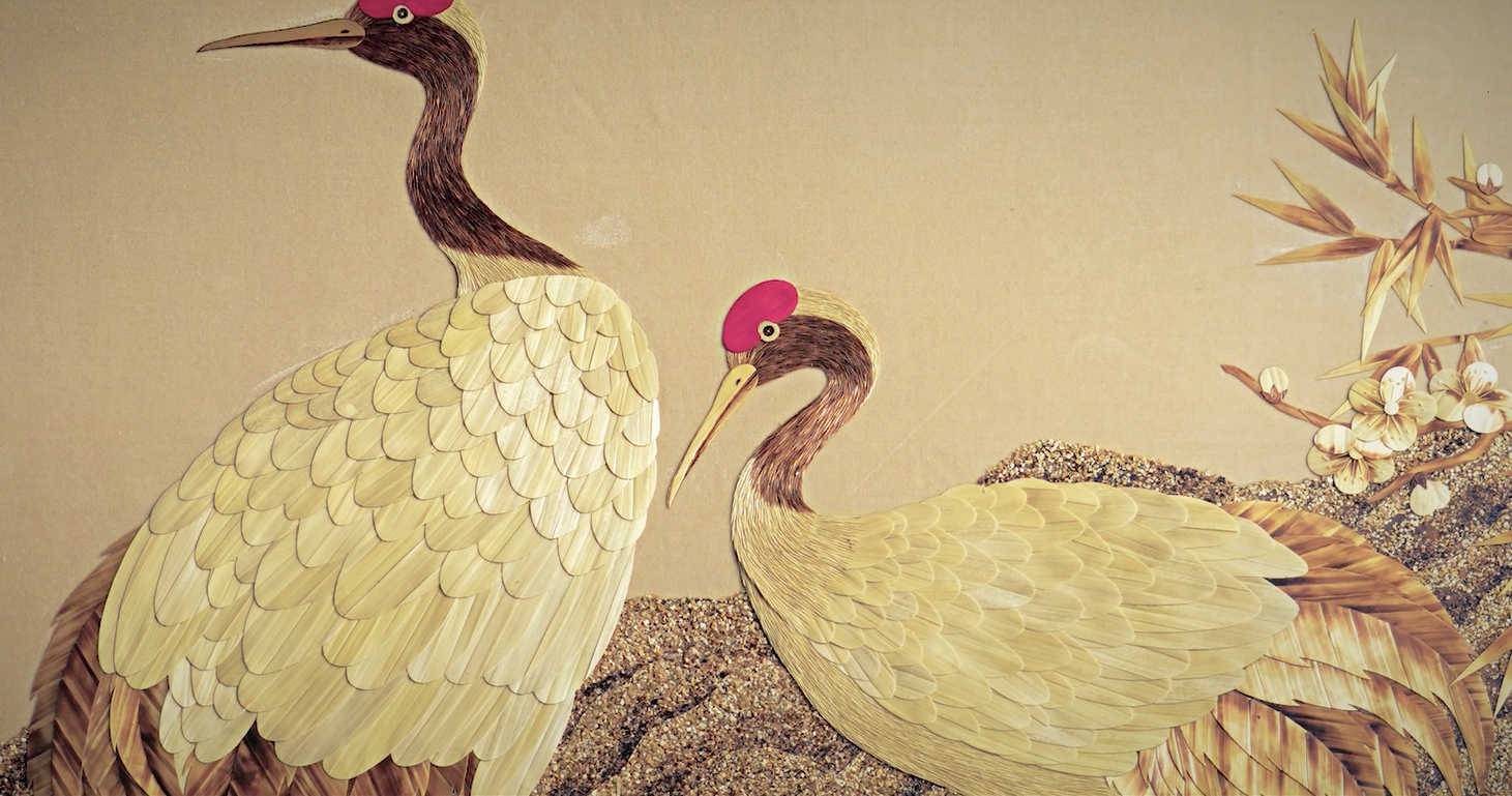大丰麦秆剪贴画是江苏省非物质文化遗产,由精选处理过的麦秆进行制板、裁剪、烫色、粘贴而成,创作工艺复杂,内容涵盖人物、山水、花鸟鱼虫等。麦秆画是中国独有的民间手工艺制品,它起源于东汉,兴盛于唐宋,流行于明清。麦秆最美的是它的光泽,因此制作麦秆画首先要从选择合适的麦秆开始。要挑拣长得直、长得粗、晾得好的,通过蒸煮高温脱脂后,经过处理分出“草皮”和“草心”。草皮用以制作画面主体有光泽的部分,比如鸟类的羽毛;草心用以制作画面背景无光泽的部分,比如山石等。这种搭配令麦秆画拥有丰富的表现力,并且更加有质感。