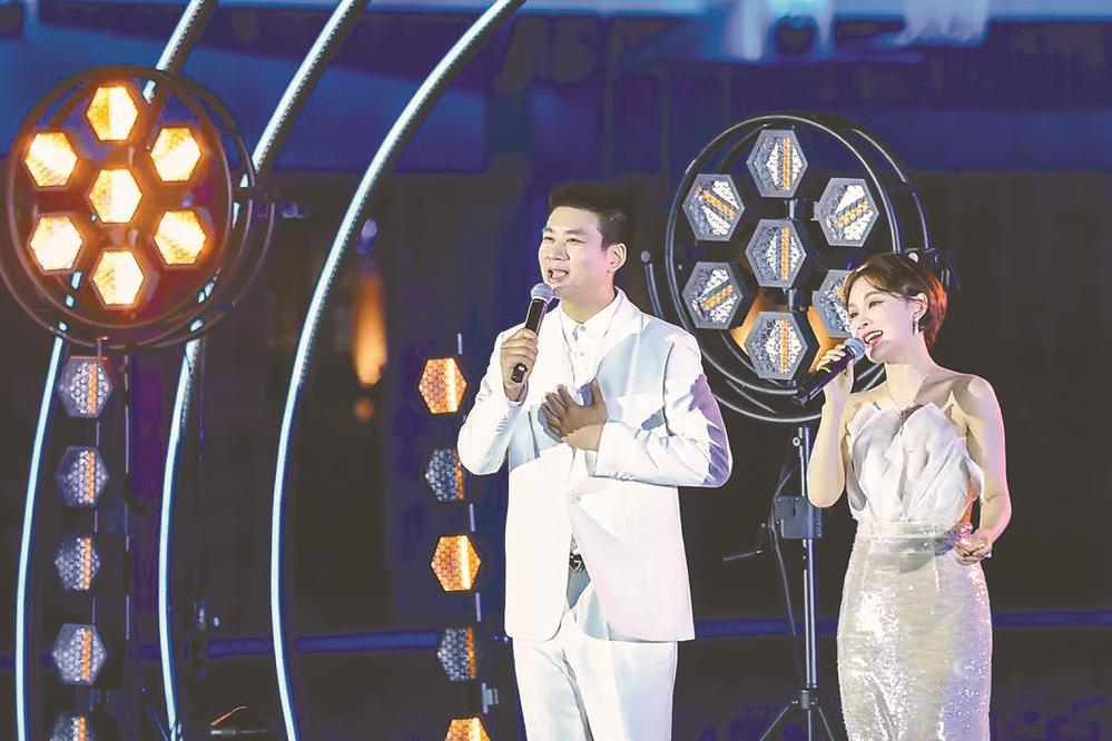 水幕之下,京淮文化大放异彩,《青花瓷》在传统戏剧的演绎下拥有了新的色彩。青年女歌手刘洋洋与江苏省淮剧团青年演员王登洲将流行歌曲演绎得既委婉悠扬又高亢明快,“天青色等烟雨,而我在等你”你一句京剧,我一句淮剧,相得益彰的表演形式令在场所有人,深感盐城文化与中华文化各有千秋,又一脉相承的魅力。