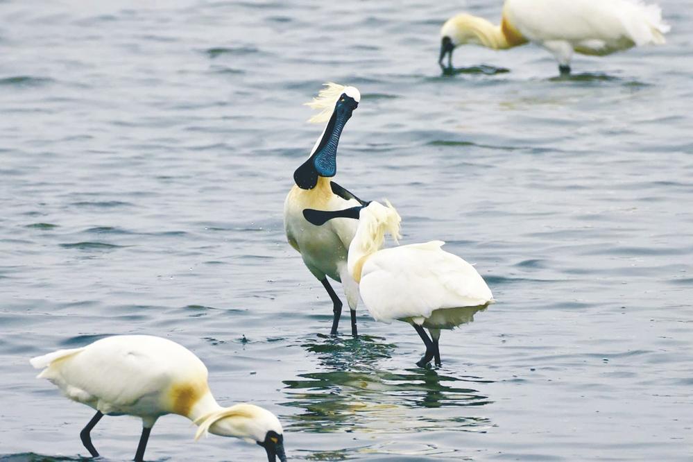黑脸琵鹭是国家一级重点保护野生动物,因其扁平如汤匙状的长嘴,与中国乐器中的琵琶极为相似,因而得名;亦因其姿态优雅,又被称为“黑面天使”或“黑面舞者”。近年来,黑脸琵鹭已成为条子泥湿地的常客。它们轻车熟路地降落在鱼虾丰富的水域,修长的双腿在水中来去自如,形如琵琶的黑色鸟喙在水里精准地捕食美味。