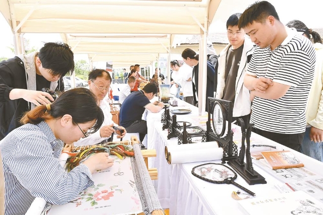 在潮间带艺术村·养庐内,盐城市美术馆馆长、盐城市书法家协会主席吴洪春为书法爱好者带来一场“一堂匠艺”名家课堂。“一城记忆”非遗直达市集热闹非凡,多个摊位展陈,好玩又好逛,非遗文创令人爱不释手,木雕、瓷刻、发绣等传统技艺展示及体验,让大家在家门口零距离触摸非遗、感知文化,感受盐城独特的文化魅力。