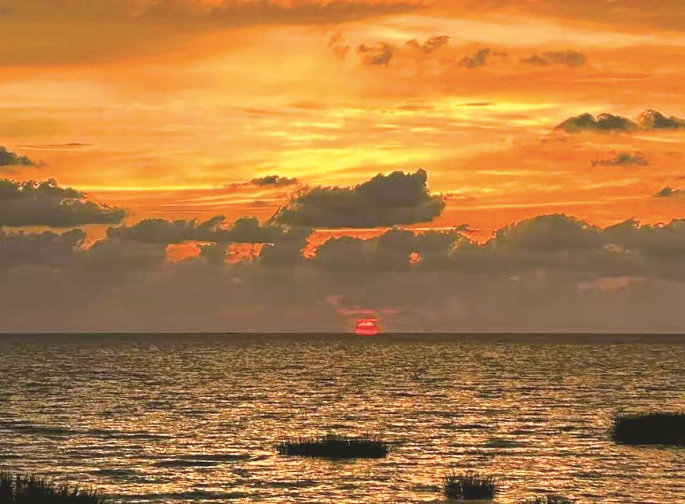 这里是黄(渤)海候鸟栖息地,世界自然遗产的核心区,拥有壮观的滩涂和一望无际的“潮汐森林”。傍晚时分,夕阳西下,将天空、滩涂和潮水染成一片醉人的金色。站在海堤上,与好友并肩看一场盛大的海上日落,鎏金的色彩是青春最辉煌的注脚。